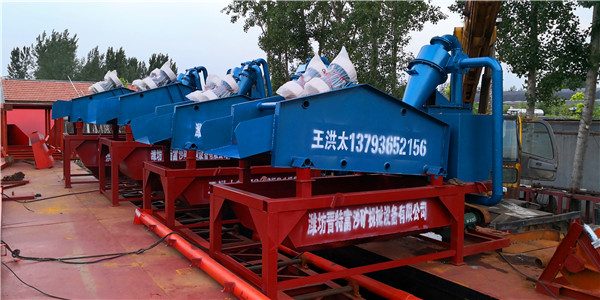 工作過程:泵將砂水混合物輸送至旋流器,離心分級濃縮的細砂經沉砂嘴提供給振動篩,經振動篩脫水后,細砂與水有效分離,少量細砂、泥等經返料箱再回到清洗槽,清洗槽液面過高時,經出料口排出。直線振動篩回收物料重量濃度為70%-85%。調節細度模數可通過改變泵轉速、改變砂漿嘗試、調節溢流水量、更換出砂嘴來實現。從而完成清洗、脫水和分級三種功能。